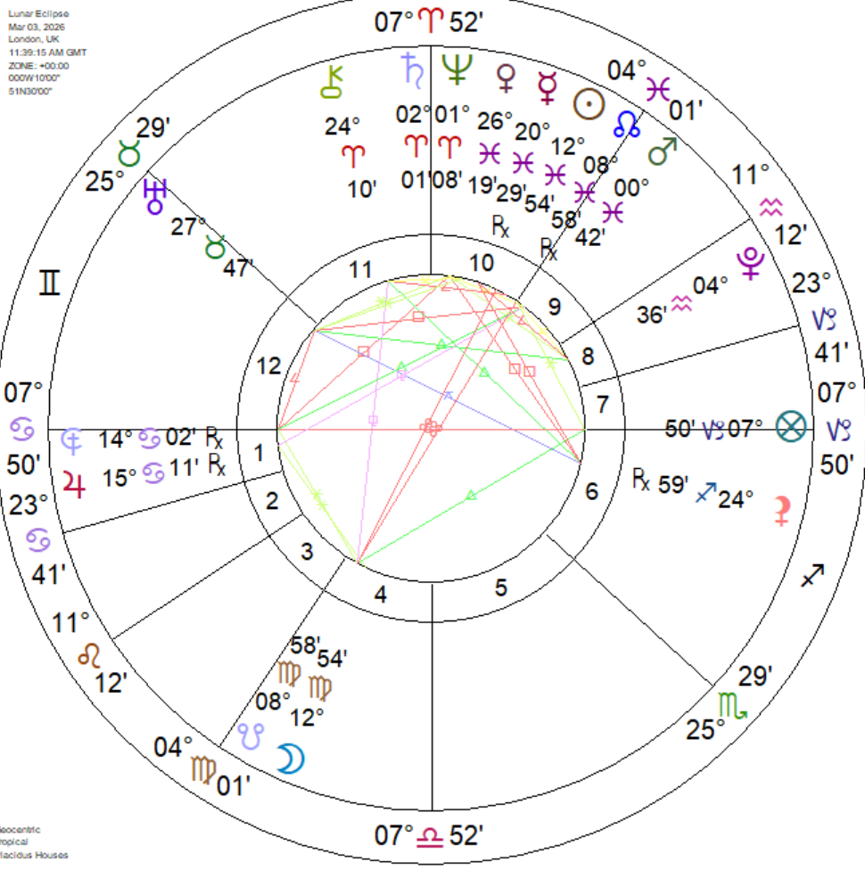 The March 3 Lunar Eclipse is in Virgo. It could lead to vulnerable health, immune system or body issues. Also, incidences involving work, employment or co-workers. Sometimes in Virgo, our pets require extra care. The main theme of all Lunar Eclipses, is to be cautious just before, during and after the peak date, March 3, for any risk taking, mistakes in judgment, and in this case, do not take risks with being around very sick people, food poisoning, unclean environments such as mold of fungus. Be cautious with your work situations, how your co-workers are behaving, reacting to things, or any form of pressure to help out, serve or step up and take on someone elses’ work. The Moon inconjuncts Pluto, not a good outcome.
