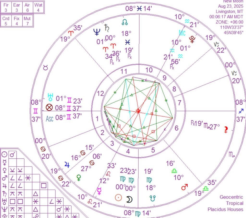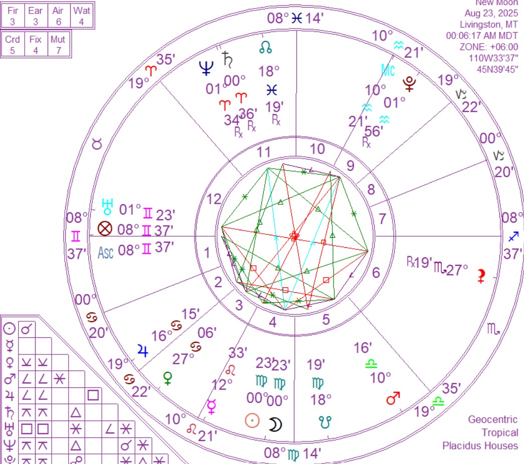 Pluto is in an awkward disjointed angle to the New Moon and had been in an opposition for the first two weeks of August to Mercury. Pluto inconjuncts the New Moon on one side, and Saturn Neptune inconjuncts the New Moon on the other side.