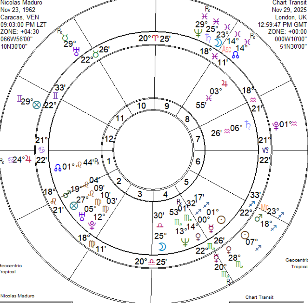 November 28 – December 4, 2025 Mars at 18* – 23* Sagittarius, is activating Maduro’s 6th house of practicality, military and personal common sense. The Mars is in a trine which motivates the person and his 6th house military, towards a more agreeable and compliant role, (this definitely includes 6th house military) – it emphasizes a theme toward being of service rather than oppositional and defiant. This astrology definitely is not describing a person fighting back as we are hearing in the news, but compliant, including the majority of his military.