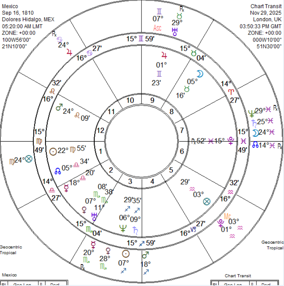 The Mercury Retro at 6* Sagittarius, also conjoined (triggered the dysfunction of leaders) Mexicos’ Neptune also beginning end of October, peaking November 9 up through December 4 – ending December 17 2025. This Mercury was like a communication, a message given to leaders, and their relationship with others to put them on notice, what is going to happen, a re-arrangment of powers in that region.