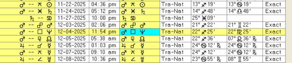 December 4 would be the start of this process, culminating in the end of the war in Ukraine, from January 14 up through February 1 2026. One way or another, a big change will occur in Ukraine’s position. January into February, Neptune inconjunct Ukraine’s Sun at 0* Virgo, once more. (It began March 31, 2025 through October, 2025 – and is back again for the last time, mid- January 2026.)