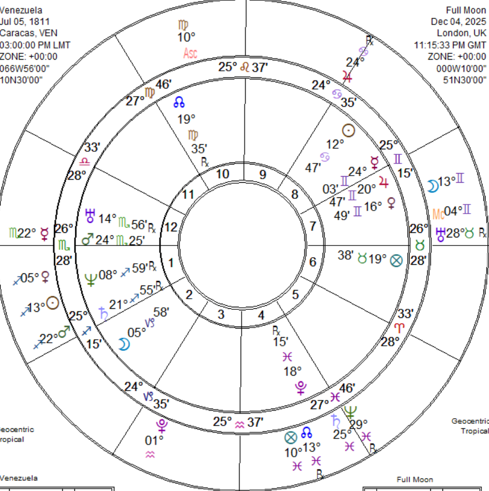 The recent Mercury Retrograde which maximized its power at 6* Sagittarius on November 9, and continued its influence throughout November up to December 17, 2025 – is and was a major initiator for the change – a trigger if you would call it – sitting right on Venezuela’s own Neptune in the 1st house. This activated an exposure or marked a reveal like ripping the Neptunian veil off of clandestine activities.