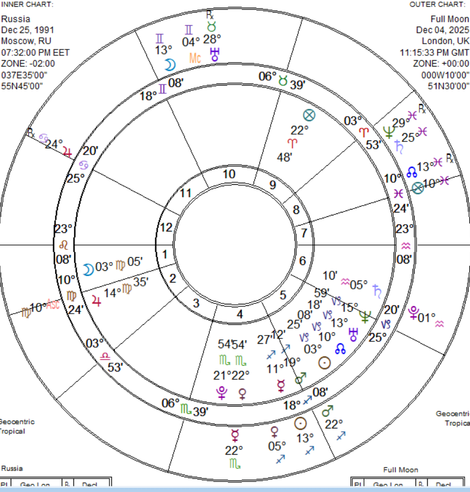 December 4 Full Moon is activating Russia’s Mercury, which prompts a country towards expansion attempts (again) because of serious financial needs. (Jupiter rules Russia’s Mercury in Sagittarius, in the 4th house of land, home, financial abundance and territory, and Jupiter is in Cancer in 2025/2026 trine Russia’s Venus and Pluto in Scorpio.)