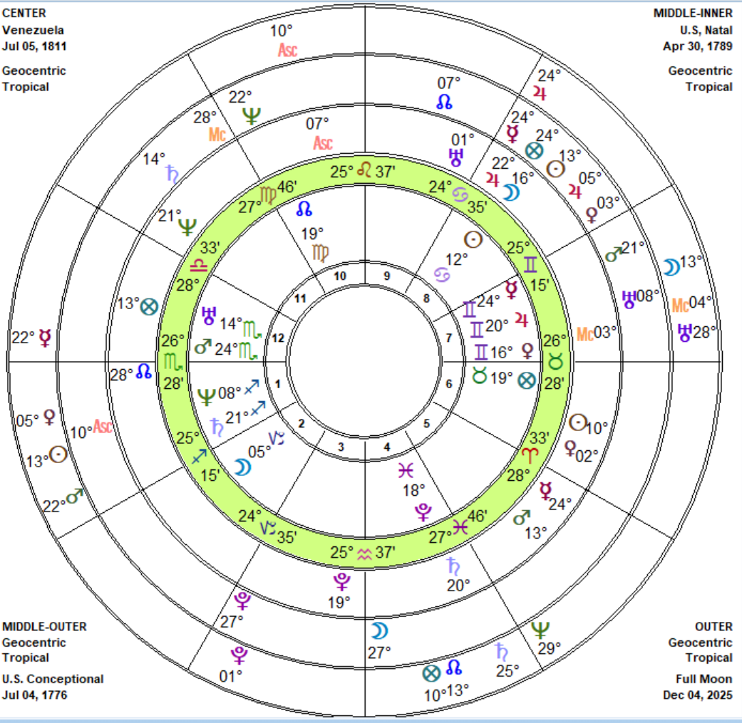 The Full Moon’s Sun in Sagittarius’ inconjunct to the Natal Sun’s Sun in Taurus, is mirroring the other U.S. Chart also experiencing an inconjunct from the Full Moon’s Sun. In otherwords, The Full Moon day, December 4 2025’s Sun, is at 13* Sagittarius. It is inconjunct both U.S. Suns – The natal 1789 Sun at 10* Taurus, and the Conceptional 1776 Sun at 13* Cancer, forming a finger of God, or a YOD. ( It is also coincidentally, inconjunct Venezuela’s Sun at 13* Cancer. Venezuela’s Sun sign is exactly 12* Cancer, the U.S. Conceptional 1776 Sun is at 13* Cancer, so Venezuela’s Sun, it’s presence, power and circumstances it is in, is directly entangled with the U.S. at this time, as it is lined up with this Full Moon Sun, inconjunct, which is part of the adjustment, shift and inconvenient change going on, fascinating!) see quad chart below for those who want a visual….All eyes are pointing towards the Full Moon moment, especially the position of the Sun, which is always the director or leader of the Solar System. It dictates the way of power, especially if it is at the tip or finger, of the Y, the finger of God configuration.