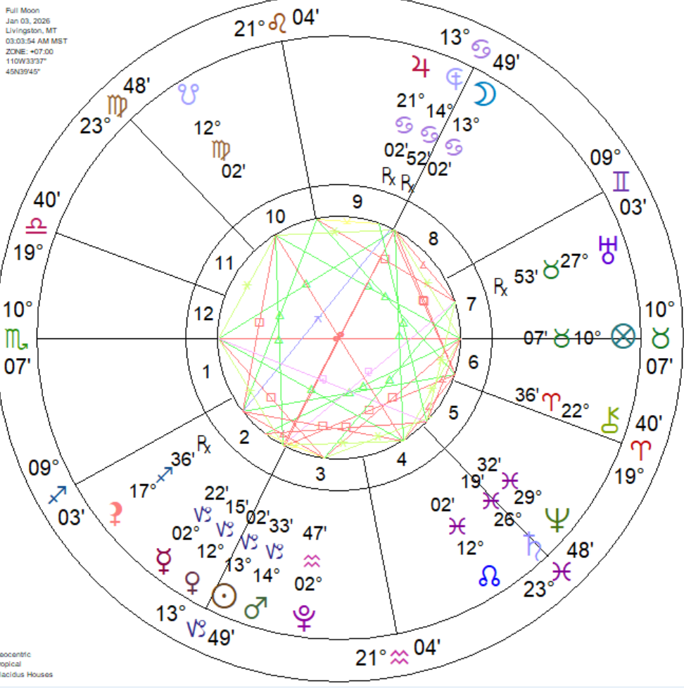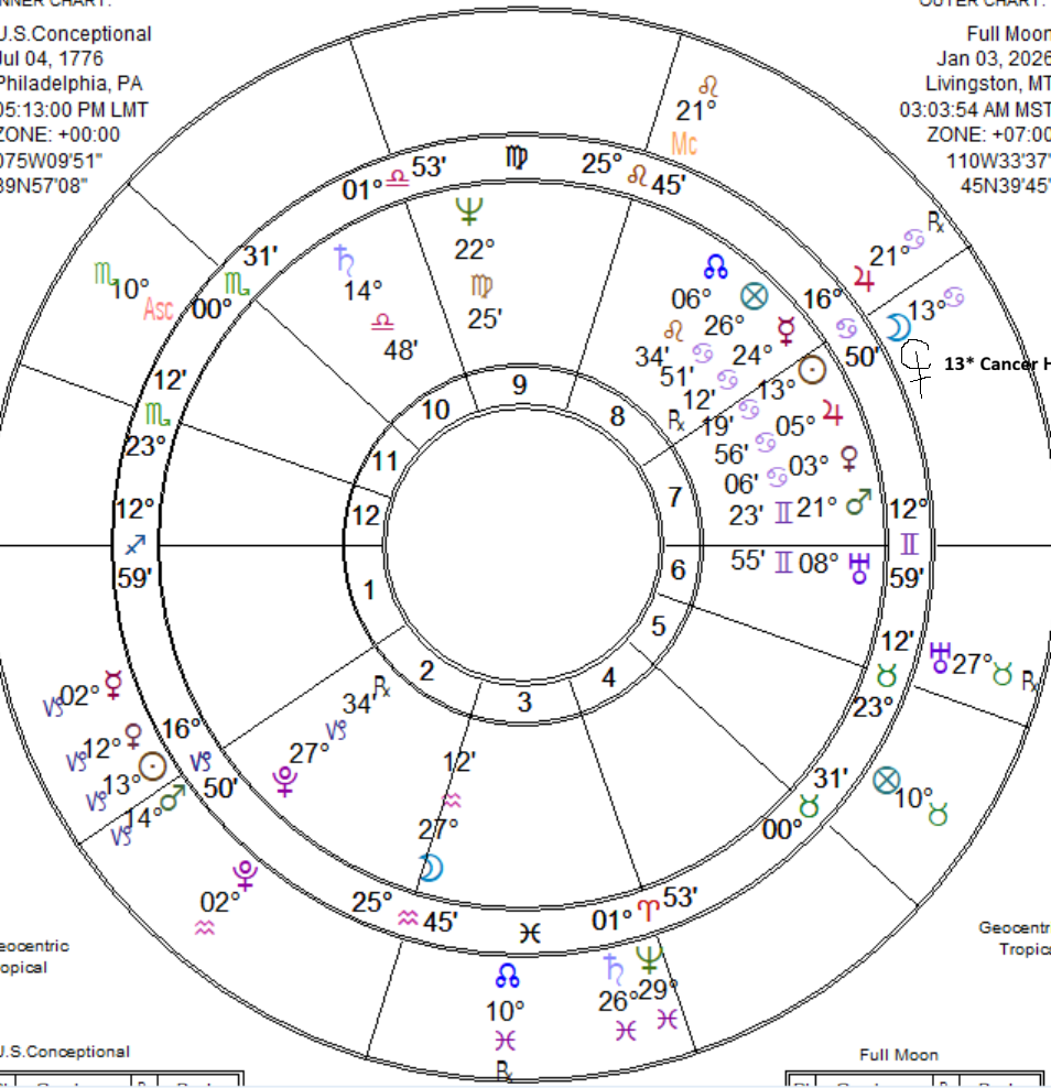 This is disturbing and may have been in the works for the past year and a half already since Hades was exactly on the U.S. Sun since July/ August 2024. Now it is aligned with the Full Moon at 13* Cancer, on the Sun, which is a new event coming to a head. Whenever Hades is involved, it will compromise the people’s security and future financial well being. Cancer deals with money, along with safety, land, real estate, boundaries, etc.. From now into 2026, the U.S. is engaged in stranger agendas, yet in general, I do feel the world is rising up towards becoming more spiritual. The good news about the Full Moon, is that once it crests on January 3, there may be fall out for a while, but it’s technically over after the 3rd.