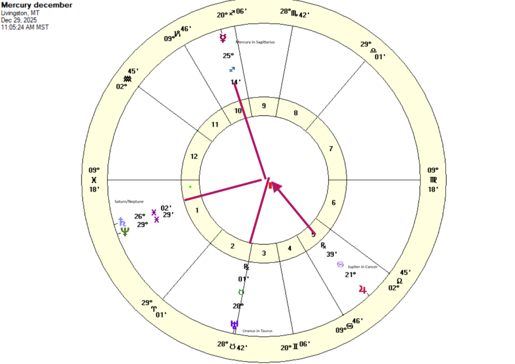 End of year theme – Mercury finalizing its two month cycle in Sagittarius (Governs our mindset, where our head is at during the last week’s winding down of 2025; Hermes Mercurius guides us through the transition from one world to a new one)