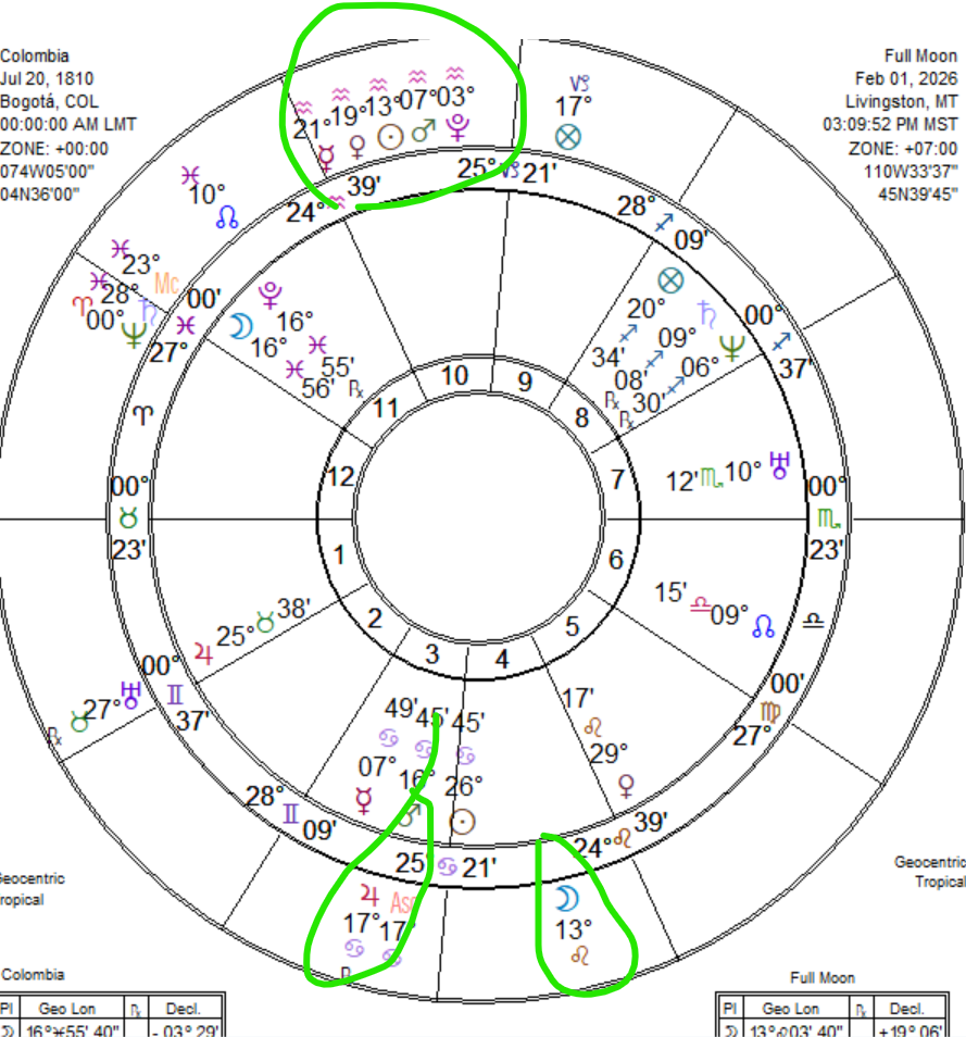 The Full Moon on February 1, will be moving towards an interesting point in the chart, February 1 2026, the culmination of an event for Colombia, so let’s take a look at it’s chart below.