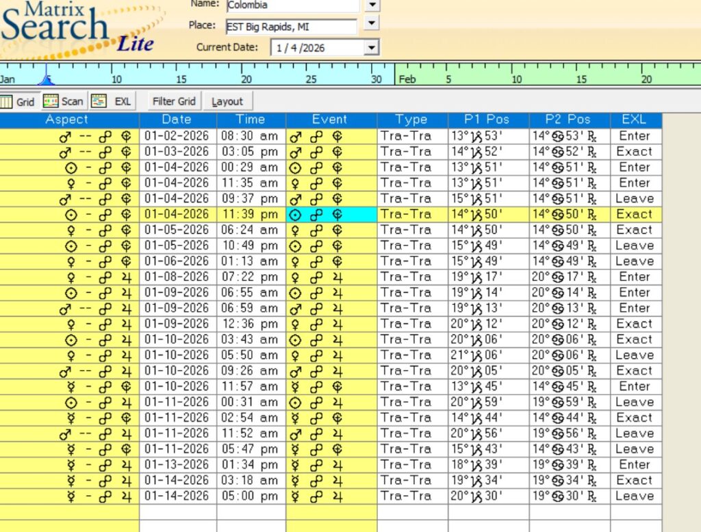 January 8 -15th. The very last opposition/conjunction for the Month of January, is Venus, Mercury, Mars, Sun oppose Jupiter at 17-22* Cancer. ( Jupiter at 19-20 exact, and Hades at 14* are not connected in case you were wondering, which is good.)
