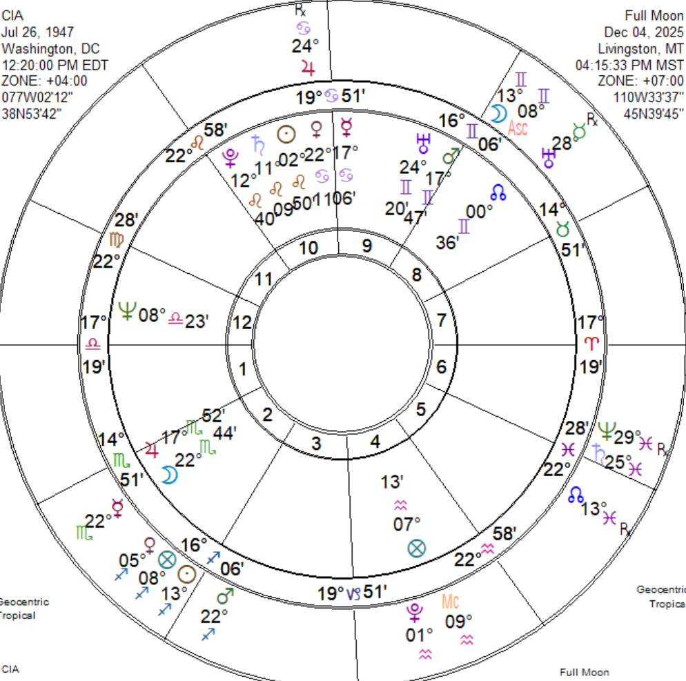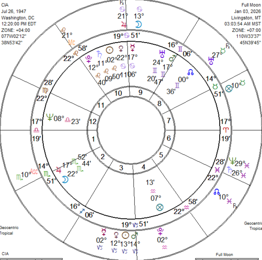 There was activation from the Full Moons on both December 4 and January 3, 2026 on the CIA’s natal charts, but what is most prominent, is the Jupiter transiting the agency’s Midheaven from September 2025 up through April 2026, once in twelve years, on the chart. This is typically a strong executing of programs, securing and bringing about a multi-complex operation, not in just Venezuela alone, but other regions all 2025- 2026. The Moon rules CIA’s Cancer Midheaven.