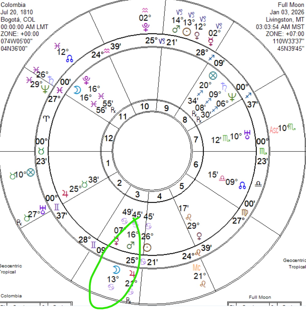 The Full Moon and other planetary positions, are all indicating Colombia is next for securing the region since the Full Moon on January 3, 2026 also landed on a key area like the other charts we explored. Colombia’s Mercury / Mars particularly. Mercury (intelligent observations of the playing out of global events in that region), and Mars in Cancer, (the drive to acquire security, abundance and prosperity for the people).
