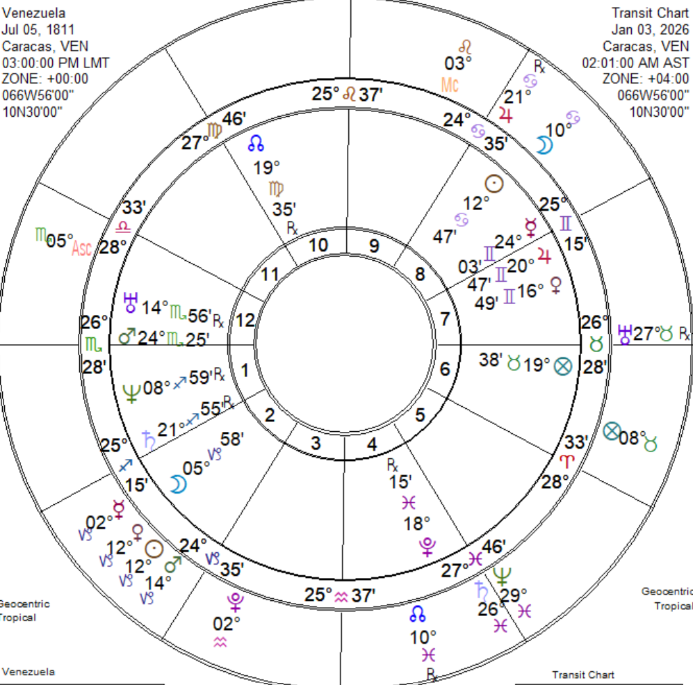 Uranus, our planet of eruption of change, sitting upon Venezuela’s 7th house of close relationships marks a moment in time, from May 2024 – March 2026 approximately. Once in 84 years. It also has to do with interference or an injection of game changer agencies and/or individuals influencing Venezuela’s future. But what is quite relevant, is how precisely the Full Moon in Cancer, locked exactly on to Venezuela’s Sun January 2/3 2026, and the Full Moon’s Sun, on Jan 3, conjoin transiting Mars, the planet of aggression, and Mercury (intelligence) all lined up displaying a strong force of strategy and power, (calculated Power) conjoin Venezuela.’s Moon in Capricorn.