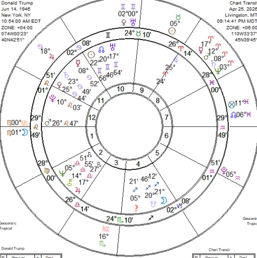 4th, Venus and Uranus elevated at the top of his chart, triggering a disruptive unexpected volatile social event – it began at the start of the week, April 20, with David Wilcock’s death, and now Venus/Uranus in a position involving a social public exposure at the top of Trumps’ Chart, square his Ascendant (body and physical area of his chart) and the transiting Moon in Leo today (4/25) was also right on his ascendant amplifying the focus as a personal potential crisis.
